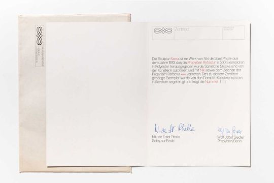 Auf beiliegendem Zertifikat mit blauem Kugelschreiber signiert: N. de St. Phalle.