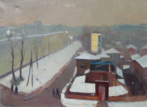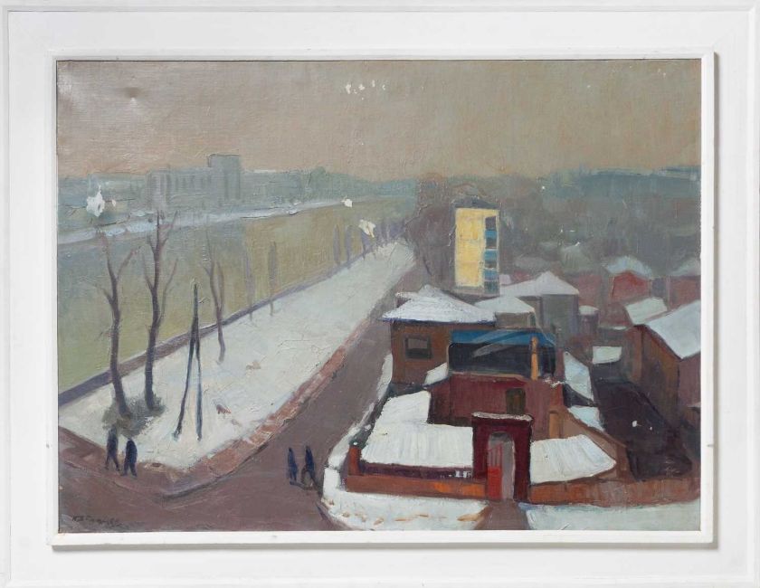 Zustand: Krakelee mit Farbabplatzungen an mehreren Stellen, Leinwand mit Druckspuren, an einer Stelle durchstoßen.