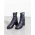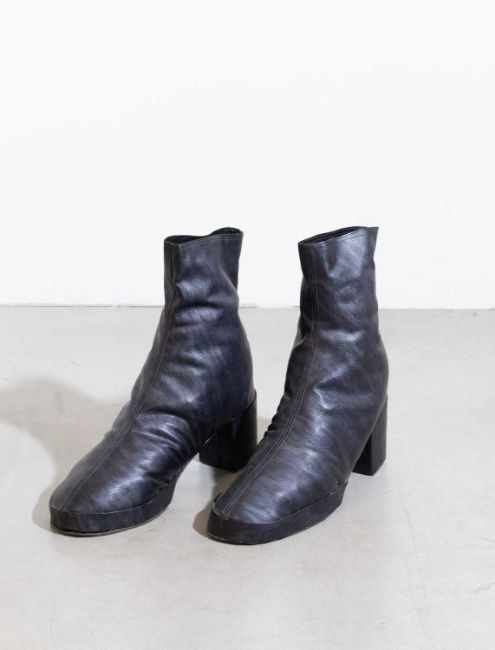 Zwei überlebensgroße Stiefeletten, jeweils aus Kunstleder, Rosshaar und Schaumstoff.