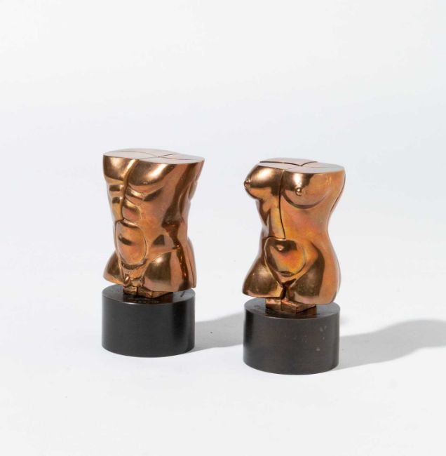 Zwei Torsi aus jeweils fünf abnehmbaren Elementen, jeweils aus Bronze, gold patiniert, in Bronzesockel gesteckt.