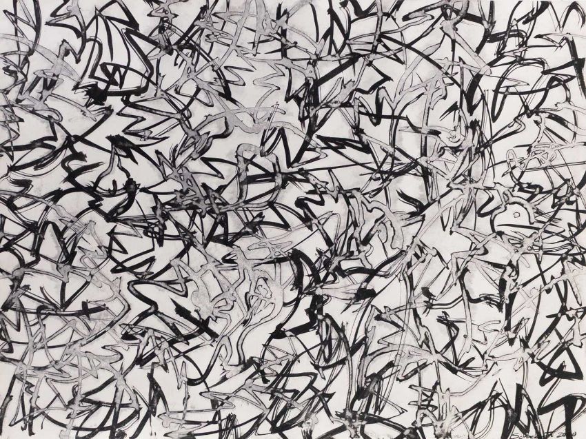 Am unteren Blattrand in schwarzer Ölkreide signiert und datiert: Schackwitz, 2000. Sowie verso in schwarzer Ölkreide signiert, betitelt, datiert und mit Werkangaben: Michael Schackwitz, Vogelgezwitscher, 2000.