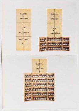 Objektkasten aus Holz, mit drei Flügeltüren. Bestückt mit 117 mit Quellwasser gefüllten Glasfläschchen, jeweils mit Wachs verschlossen und mit beschriftetem Etikett versehen. Mit drei Schlüsseln. Aus einer Auflage von 55 Exemplaren. Mit einer beiliegenden Publikation: Heilrituale an bretonischen Quellen. Auf einem beigegebenen Etikett mit schwarzem Fineliner signiert und nummeriert: Daniel Spoerri, 33/55.