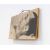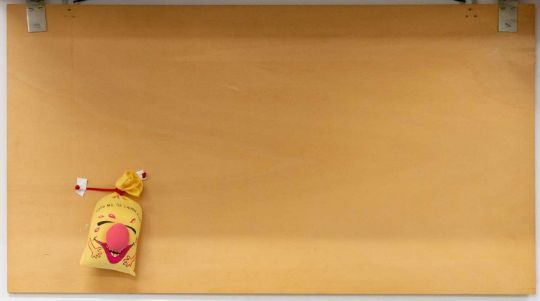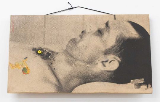 Offset auf Leinwand, mit Objektapplikationen (Farboffset auf Papier, collagiert, sowie Lachsack), auf aufklappbare Holzplatte montiert.