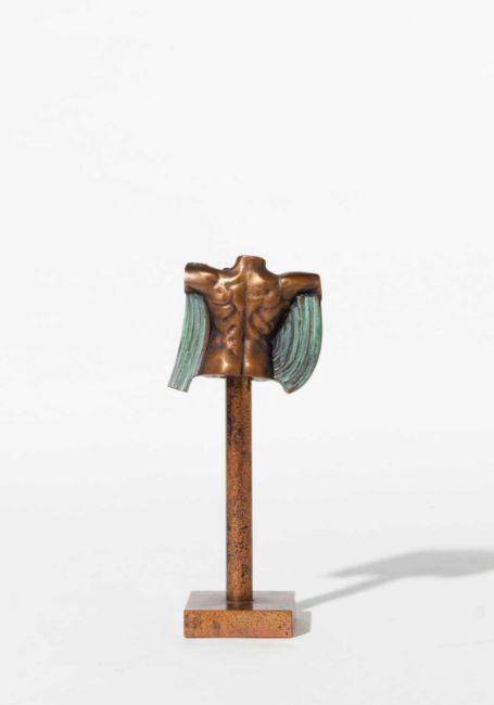 Bronze, verschieden patiniert. Mit Brustpanzer aus poliertem Messing, abnehmbar. Auf Bronze-Säule montiert.