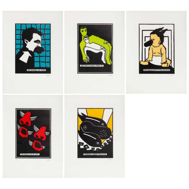 Fünf Linolschnitte auf Karton.