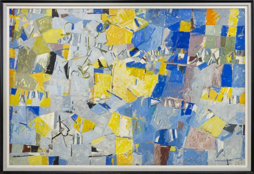 Matthias Koeppel war Maler, Dichter, Professor und Stadtchroniker. Schon früh entwickelte er einen unverwechselbaren Stil, mit dem er sich von der abstrakten Malerei der Nachkriegszeit absetzte – ein Vorhaben, das er als Mitbegründer der „Schule der neuen Prächtigkeit“ mit Malern wie Johannes Grützke, Manfred Bluth und Karlheinz Ziegler teilte. So verband Koeppel in vielen seiner Gemälde einen altmeisterlichen Naturalismus mit einer ironischen Perspektive auf zeitgenössische Themen, insbesondere den Mauerfall. Umso bemerkenswerter ist das vorliegende Gemälde, das als Frühwerk von der beeindruckenden stilistischen Bandbreite des gebürtigen Hamburgers zeugt. Das dichte Gewebe aus Farbfeldern in Blau, Gelb und Hellgrau lässt eine abstrahierte Dachlandschaft assoziieren, verweist aber auch auf Bildtraditionen des französischen Impressionismus, wo Lichtverhältnisse in prächtige Farbspiele übertragen werden und pastos aufgetragene Farbflächen auf das Spannungsverhältnis zwischen der flachen Leinwand und der suggerierten Bildtiefe verweisen. Zudem spannt das Gemälde einen besonderen Bogen in Koeppels Werk, zumal sich der Künstler in den 2010er Jahren vertiefend mit neokubistischer Malerei auseinandersetzte und damit zu malerischen Fragestellungen seines Frühwerks zurückkehrte. Das Bild hing jahrzehntelang im Foyer des rbb – ein diskretes Wahrzeichen und ein Zeuge Berliner Geschichte.