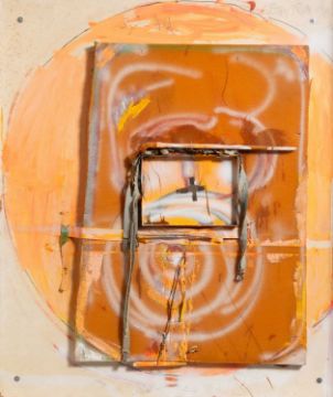 Schaumstoffmatte, Kartonschachtel, Pinsel, Hosenträger und Schuhband, mit Acryl übermalt, auf festem Karton montiert.
