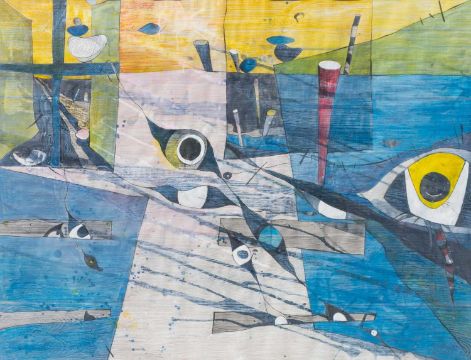 Frottage, Gouache, Grafit und Buntstift auf Papier.