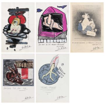 Fünf Mischtechniken, u.a. in Aquarell, Gouache, Ölkreide, Deckweiß oder Bleistift auf Bütten bzw. leichtem Karton.