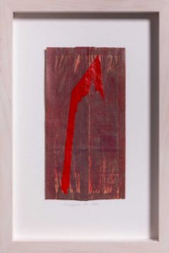 Öl und Wachsmalstift auf bedruckter Papiertüte, collagiert.