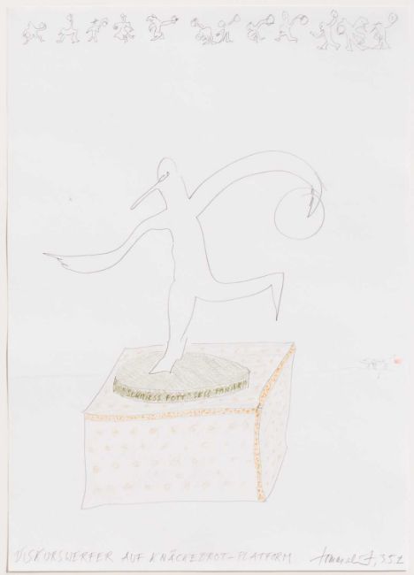 Am unteren Blattrand mit Bleistift signiert, betitelt und datiert: Tomas Schmit, DISKURSWERFER AUF KNÄCKEBROT-PLATFORM, 3.5.2.