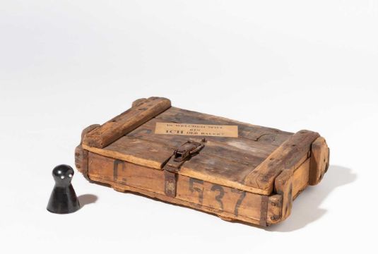 Holztruhe mit Aufkleber, sowie dazugehörige Schachfigurine aus Ton, glasiert, mit Augen aus Kunststoffperlen.