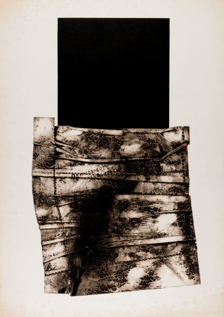 Aquatinta Radierung von zwei gepressten, perforierten und zerknitterten Platten. Rechts unten mit Bleistift signiert, nummeriert 7/25 und datiert 1971 sowie links unten betitelt B13 In memorium E. Kuhn. Bildmaß 59,5x 39,5 cm, Blattmaß 59,5x 49,5 cm.