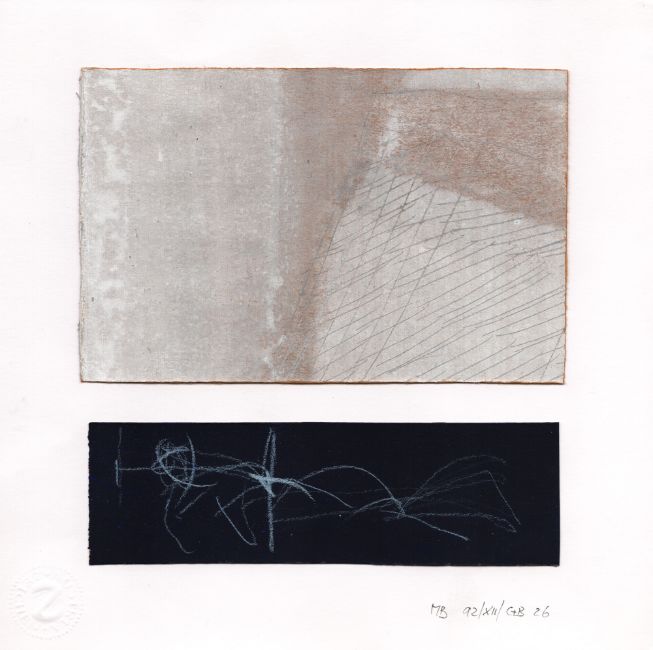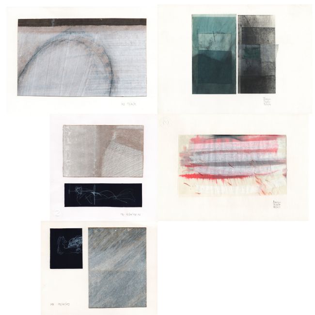 Fünf Mischtechniken auf Papier und Karton, teils collagiert. Jeweils signiert bzw. Monogrammiert MB und datiert 1989, 1990, 1992 und 1993. Blattmaß 14,1x 17,4 bis 21x 29,8 cm.