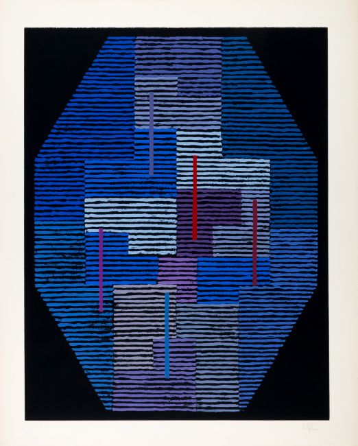Serigraphie auf chamoisfarbenem Velin. Rechts unten mit Bleistift monogrammiert sowie links unten nummeriert, Exemplar 41/70. Trockenstempel Edition Domberger Stuttgart. Bildmaß 64,8x 50,3 cm, Blattmaß 74x 60 cm.