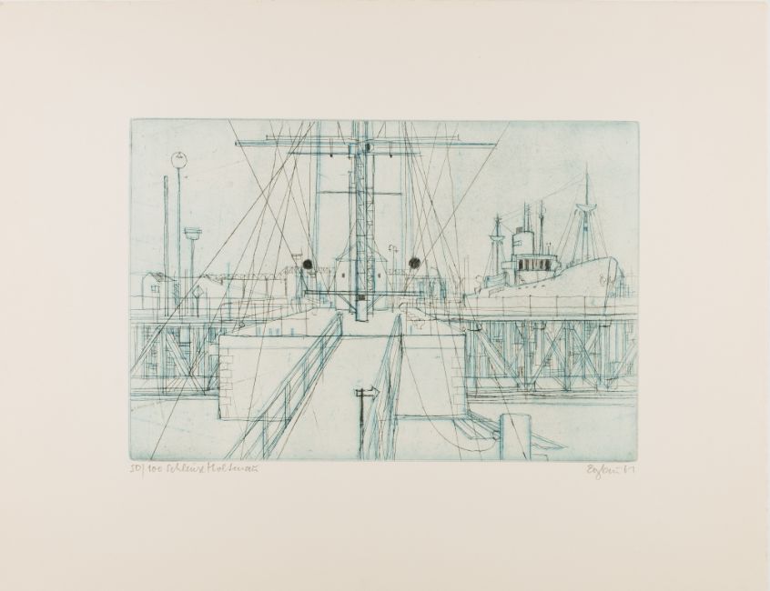 Farbaquatinta-Radierung auf Velin. Rechts unten mit Bleistift signiert und datiert (19)61 sowie links unten betitelt und nummeriert, Exemplar 50/100. Plattenmaß 21,6x 32,3 cm, Blattmaß 38x 49 cm.