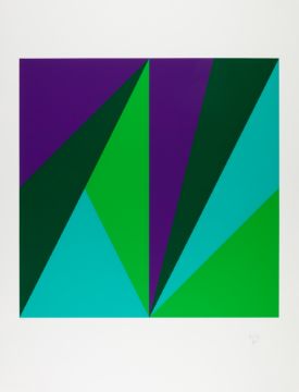 Farbserigraphie auf leichtem Karton. Rechts unten mit Bleistift signiert und datiert (19)91 sowie links unten nummeriert, Exemplar 8/100 und Trockenstempel Edition Domberger Columbus. Bildmaß 50x 50 cm, Blattmaß 76x 58 cm. Beigegeben: Originaler Papiereinband aus dem Mappenwerk, 77x 59 cm.
