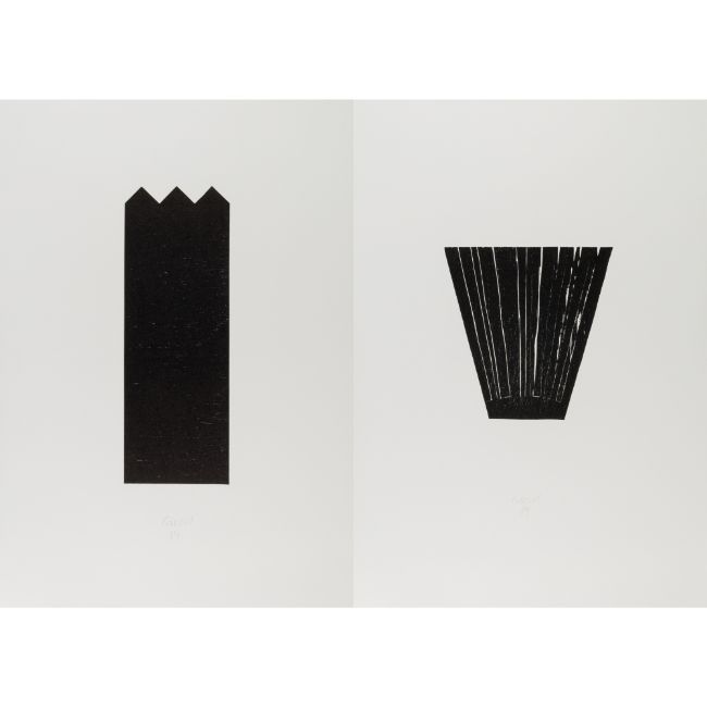 Zwei Holzschnitte auf Papier. Jeweils mittig unten mit Bleistift signiert und datiert (19)84. Blattmaß 50x 35 cm.