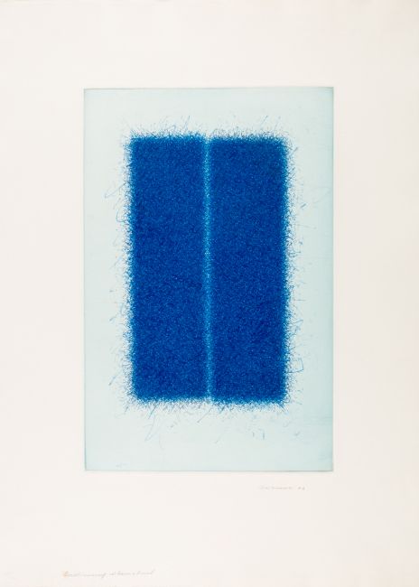 Überzeichnete Radierung auf Velin. Rechts unten mit Bleistift signiert und datiert (19)82. Plattenmaß 29,5x 19,2 cm, Blattmaß 45,7x 33 cm.