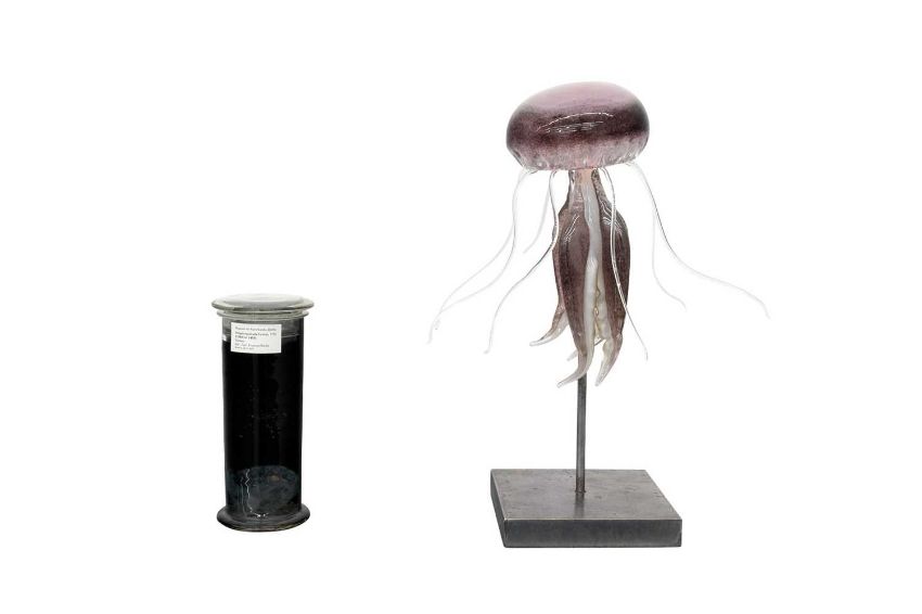 Zweiteilig: Qualle aus Murano Glas, auf Eisen-Sockel. Präparierte Leuchtqualle im Glas (Pelagia noctiluca).
