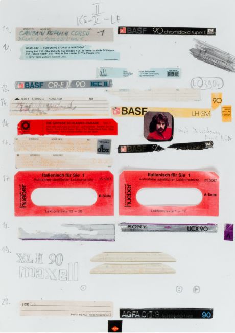 Gregor Hildebrandt (1974 Bad Homburg vor der Höhe - lebt in Berlin)Kassettenschallplatte. 2006.44 bespielte Kassetten und ein Kassettenrad, gewickelt.Durchmesser: 30 cm.Werkverzeichnis: Inventarnummer GH/S10KS-V-I bis -VI. 2007.Sechsteilig: Jeweils Etiketten, Klebeband, collagiert, und Bleistift auf Papier.Verso jeweils signiert, betitelt und datiert: Gregor Hildebrandt, KS-V-I bis KS-V-VI, 2007.Jeweils 29,7 x 20,9 cm.Jeweils im Objektrahmen freigestellt und unter Glas gerahmt: 36,6 x 27,8 cm.Jeweils verso ein Etikett der Galerie Jan Wentrup, Berlin.Werkverzeichnis: Inventarnummer GH/Z111.Ausstellung: Manifesto Collage. Über den Begriff der Collage im 21. Jahrhundert. Die About Change, Collection zu Gast in der Berlinischen Galerie. Berlinische Galerie, Berlin, 2012.Provenienz:About Change, Collection (Christiane zu Salm), Berlin.Angaben zum Künstler:• Gregor Hildebrandt wurde 1974 in Bad Homburg vor der Höhe geboren und studierte an der Kunsthochschule Mainz, der Johannes Gutenberg-Universität Mainz und der Universität der Künste Berlin. Seit 2015 ist er Professor für Malerei und Grafik an der Akademie der Bildenden Künste München. • Bekannt wurde er mit den sogenannten Tonbandbildern, für die er bespielte Tonbänder auf Leinwand oder Papier klebte, und die aufgenommenen Inhalte in abstrakte Bilder zu transformieren. • Seine Arbeit verweist formal auf den Minimalismus, was jedoch immer wieder durch das Hinzufügen subjektiver und autobiografischer Zitate gebrochen wird. • Gregor Hildebrandt wird von Emmanuel Perrotin, New York City, Wentrup, Berlin, der Galerie Almine Rech, Paris, und der Galerie Casado Santapau, Madrid, vertreten.