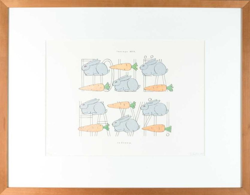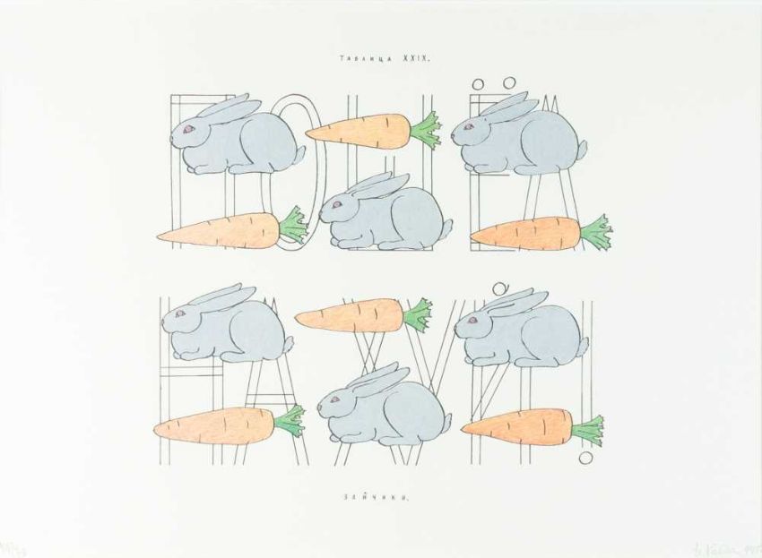 Auf Ilya Kabakovs Siebdruck sieht man Hasen, die nicht an die Möhren heranreichen. Die Möhren weichen nicht aus ihrem Blickfeld, die Hasen sind ohne das Objekt ihrer Begierde gar nicht zu denken, und die Möhren rechtfertigen sich durch ihre Beziehung zu den Hasen. Nach Lacan ist das Begehren so strukturiert, dass es einen Mangel produziert. Begehren ist also mit Mangel gleichzusetzen, es artikuliert sich als Wunsch nach dem Nicht-Erfüllbaren, dem Nicht-Haben. Vielleicht will Kabakov eine anthropologische Konstante formulieren, dass die Menschen nur als Konsumwunsch und Objektbeziehung existieren?