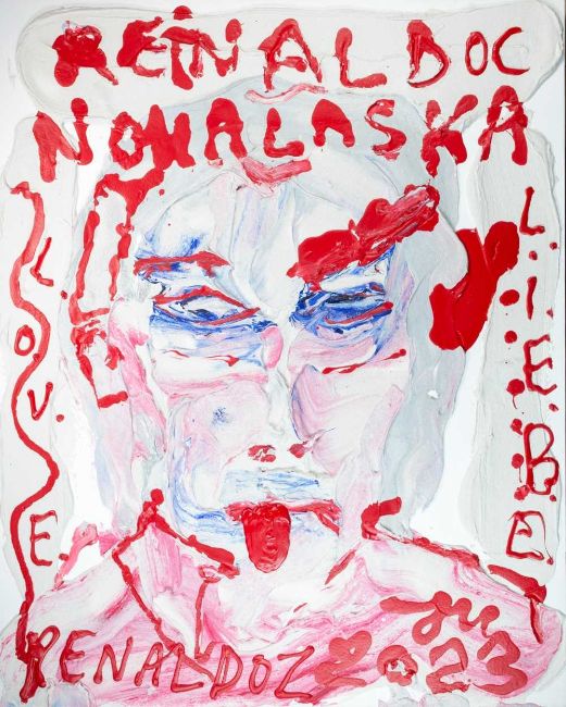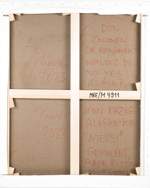 Verso signiert, betitelt und datiert: JMeese 2023, Don Colonel DR. RAY-SHARK-NALDOZ DE NO-YES ALASKÄ. Von ERZIG ALASKA-KID "MEESI" GEMALERT, ABER BITTE MIT SAHNE, 2023.