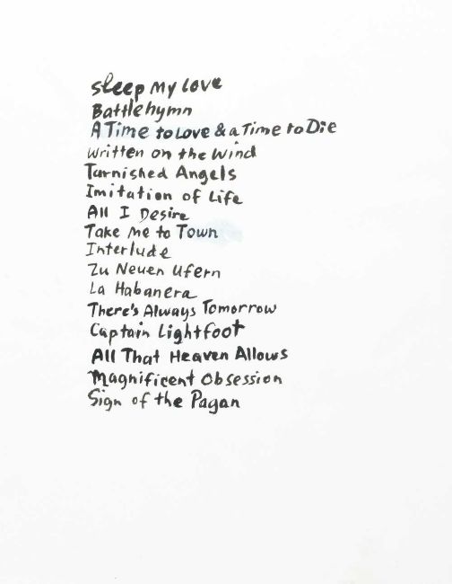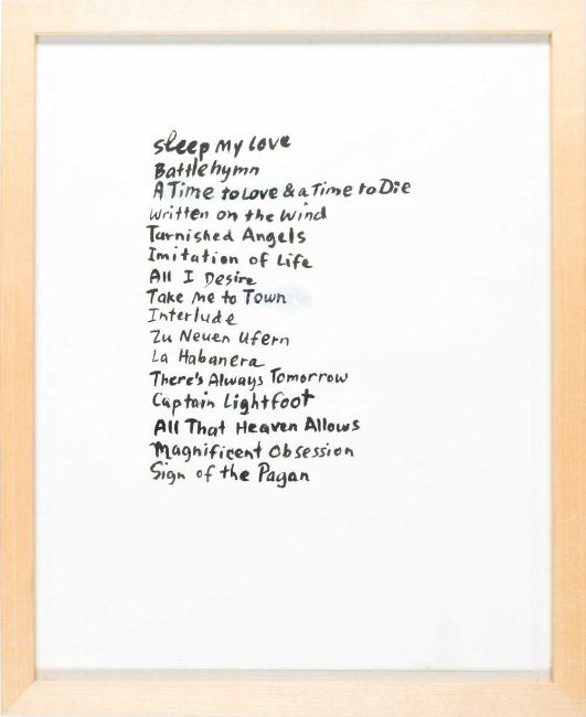 Dawn Clements aus dem Umfeld der New Yorker Smart Art Gruppe (Koons, Bickerton, Robbins, Sherman...) widmete sich ausschließlich Zeichnungen tagein tagaus. Alles sie zu Hause vorfand, wurde abgezeichnet und auf Papier wiederholt. Einkaufszettel, TV Programm, Briefe. Hier eine Liste aller Filme aus dem 50er Jahren, die sie an einem Tag und in einer Nacht hintereinander ohne Pause zu Hause angeschaut hat.