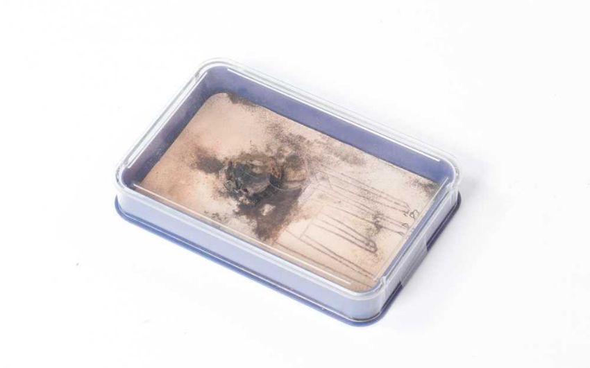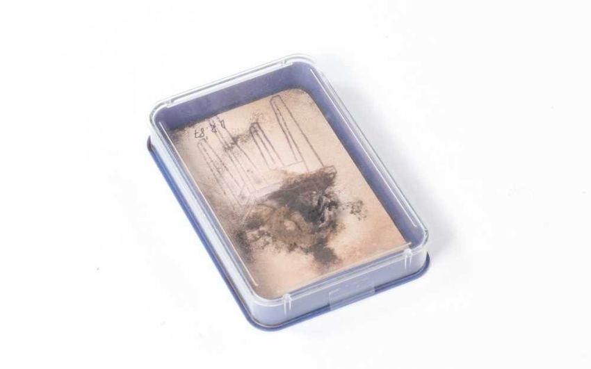 Bananenscheibe, verschimmelt, auf Papier in Kunststoffschachtel für ein Kartenspiel.