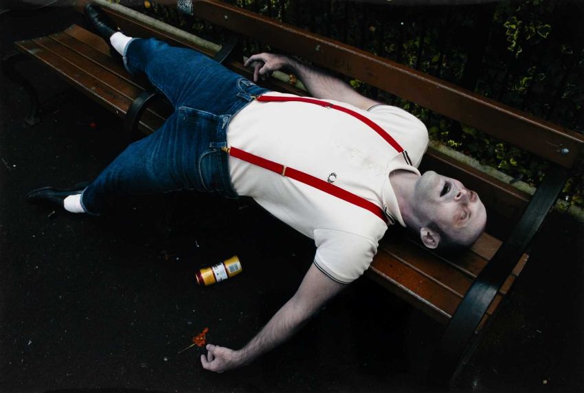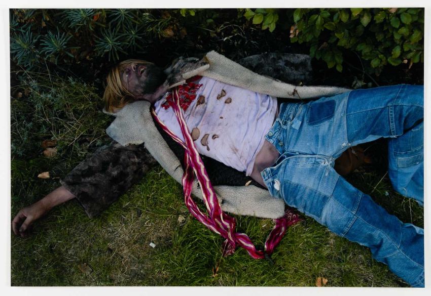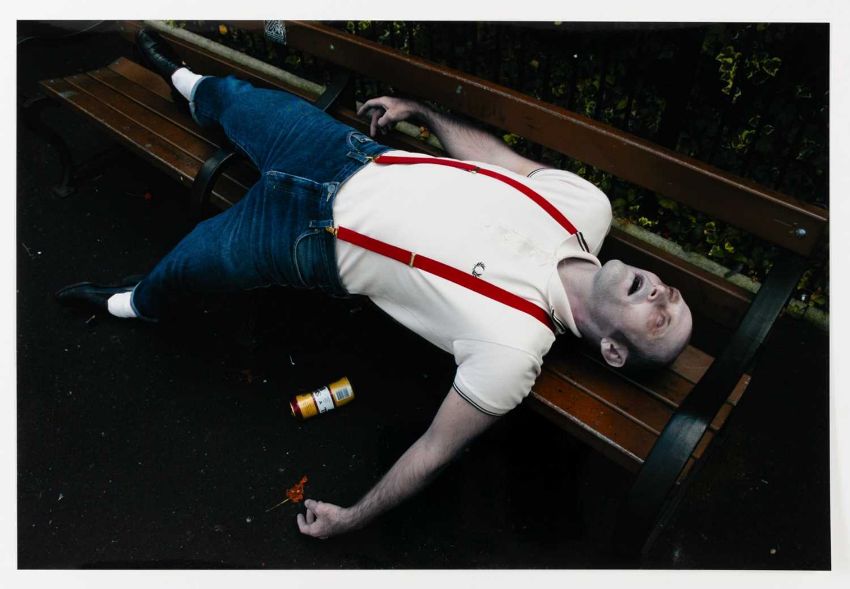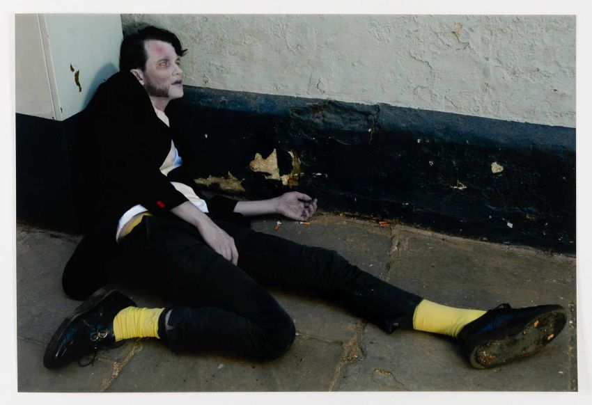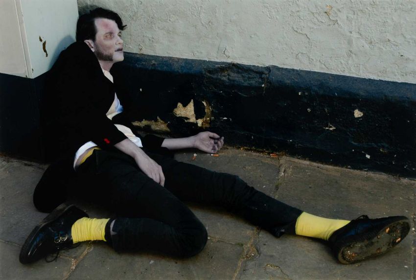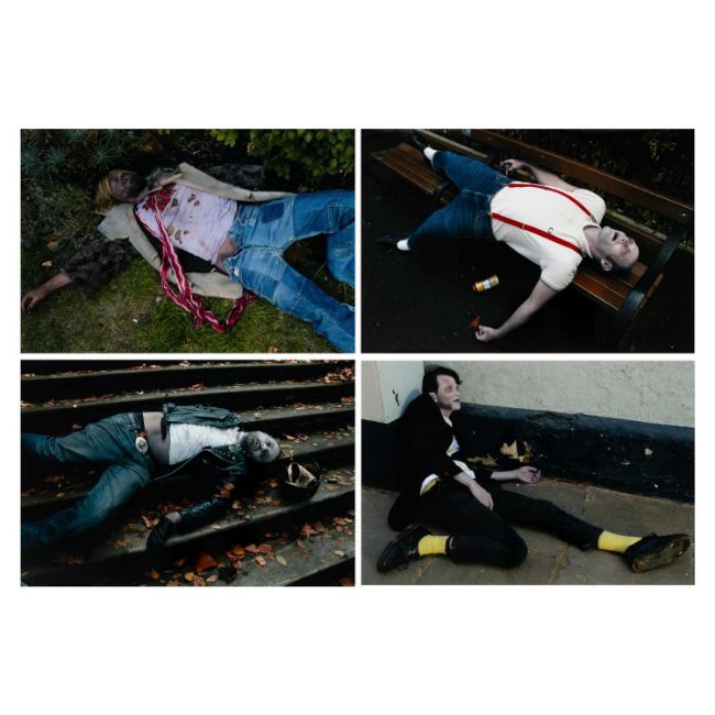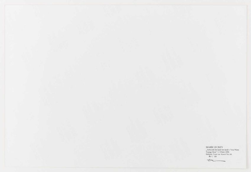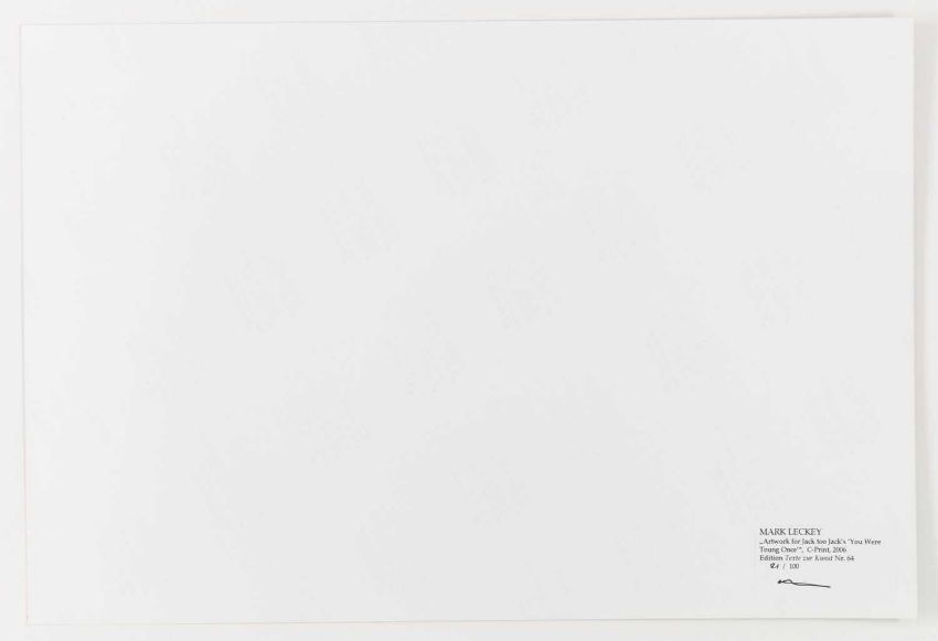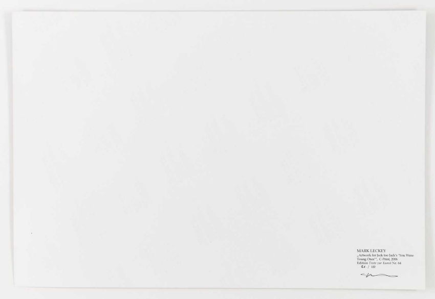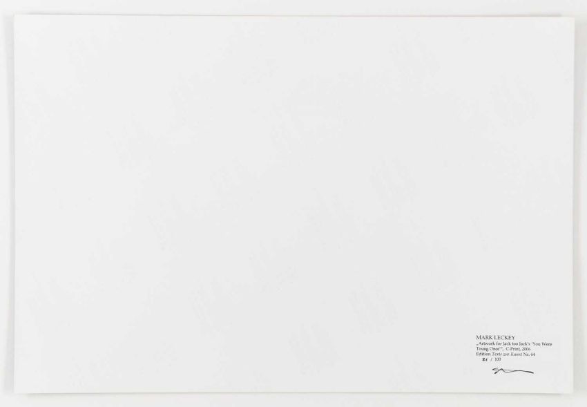 Mark Leckey (1964 Birkenhead – lebt in London) Artwork for Jack too Jack's. 'You were toung one'. 2006.Vier C-Prints, jeweils auf Fuji Color Professional Paper. Jeweils verso auf einem Etikett mit Fineliner signiert und nummeriert, sowie typografisch betitelt und datiert: mleckey, Artwork for Jack too Jack's. 'You were toung one', 2006, 21/100. Blattmaß jeweils: 30,5 x 45 cm. Herausgegeben von: Texte zur Kunst, Berlin 2006.Provenienz:Privatsammlung, Berlin. Angaben zum Werk:"Die Fotografien und Videos von Mark Leckey kreisen um die kollektiven Versprechungen von Hedonismus, Glamour und Transzendenz in Jugendkulturen. Mark Leckeys Edition für "Texte zur Kunst" umfasst vier Farbfotografien, auf denen jeweils ein Mitglied seiner Band "Jack Too Jack" als Leiche posiert. Jeder der vier trägt die Insignien einer historischen Jugendkultur - ein Hippie, ein Punk, ein Skin und ein Ted. Über sich selbst schreibt die Band: 'They were given life by the 20th century and its countercultural ambitions but now they find themselves walking amongst its ghosts ... yet, and yet they are still are alive.' " (Texte zur Kunst)