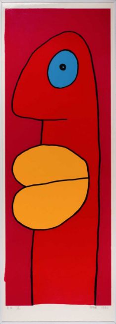 Thierry Noir (1958 Lyon – lebt in Berlin) Naoki a fait de la purée de petit pois / Ohne Titel. 1990.Zwei Farbserigrafien, jeweils auf Platte. Vom Künstler rückseitig aneinander montiert.Jeweils unterhalb der Darstellung signiert, betitelt, datiert und nummeriert: Noir, Naoki a fait de la purée de petit pois, 1990, 8/20 bzw. E.A. V. Jeweils Blattmaß: 134 x 47 cm.Gerahmt: 135 x 48 cm.Provenienz:Privatsammlung, Berlin.• Thierry Noir, 1958 in Lyon geboren, lebt und arbeitet seit 1982 in Berlin.• 1984 begann er mit Christophe-Emmanuel Bouchet und Kiddy Citny die Berliner Mauer zu bemalen.• Mit seinen rundlichen glubschäugigen Köpfen, meist gemalt in ungebrochenen klaren Farben, prägte er das Bild der Mauer auf der Westseite. Noir malt seine Bilder farbenfroh, dies strahlt Lebensfreude aus. Typisch sind für Noir bunte Köpfe im Profil mit hervorstehender Nase, riesengroßen Lippen, Kulleraugen und rundem Schädel. „Es ist die Poesie des Augenblicks, die Poetik der Sekunde, die Ironie des Momentanen, um die es mir geht“, so Noir 1996.• Später malte Noir, wie bei dem hier angebotenen Bild, auf mit Sand überzogener Leinwand, die an die Struktur von Gemäuer erinnert.