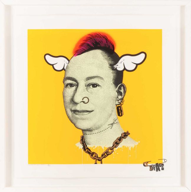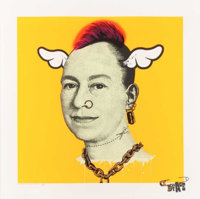 D*FACE (1978 London – lebt in London) More Punk Than You Punk. 2009.Farbserigrafie auf Velin. Am unteren Blattrand mit Bleistift signiert und nummeriert und mit Trockenstempel: D*FACE, 8/50.Blattmaß: 60 x 60 cm. Im Objektrahmen freigestellt und unter Glas gerahmt: 70,5 x 70,5 cm.Provenienz:Privatsammlung, Berlin.