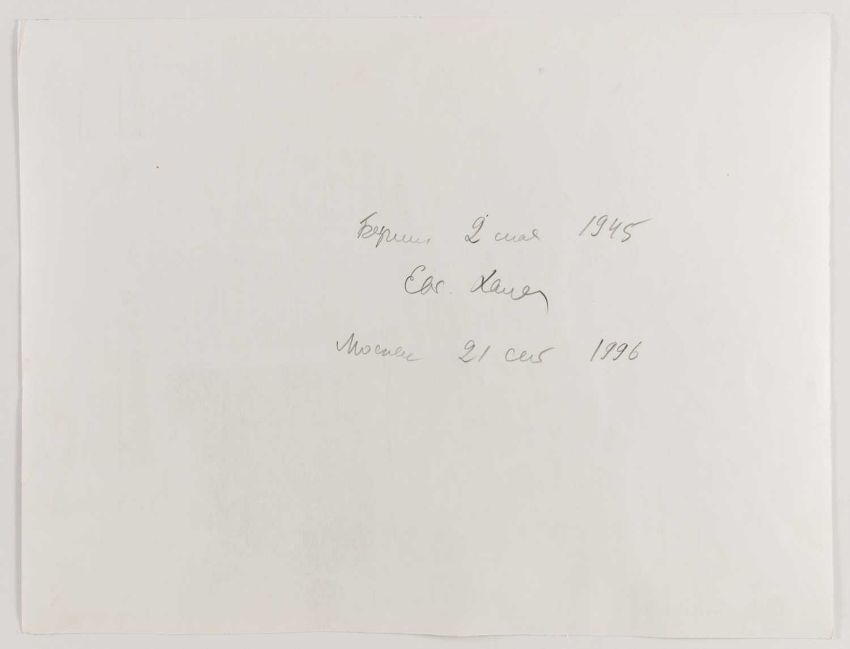 Jewgeni Chaldej (1917 Donezk - Moskau 1997) Берлин (Berlin) 2 Mai 1945. 1945/1996. Silbergelatineabzug, am Rand mit Tinte geschwärzt. Verso mit Bleistift signiert, betitelt, datiert und gewidmet: J. Chaldej (Евг. Халдей) Берлин, 2 mai 1945, Moskau 21 sep 1996. Blattmaß: 30,6 x 39,8 cm. Zustand: Unregelmäßige Blattkante, partiell Flecken, Oberflächenbereibungen, Kratzer.Provenienz:Privatsammlung, Berlin.Angaben zum Werk: Mit seiner gebraucht erstandenen "Leica" begleitete Jewgeni Chaldej die Rote Armee auf ihrem Vormarsch und dokumentierte die Befreiung Rumäniens, Bulgariens, Jugoslawiens, Ungarns sowie die Einnahme Wiens und Berlins. Dabei entstanden weltberühmte Bilder. Er fotografierte auch bei der Potsdamer Konferenz 1945, der Pariser Friedenskonferenz 1946 und beim Nürnberger Prozess gegen die Hauptkriegsverbrecher 1946. Auf diesem Bild hissen junge Soldaten die sowjetische Flagge vor der ausgebrannten Quadriga auf dem Brandenburger Tor.