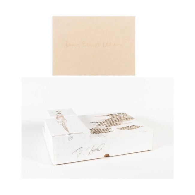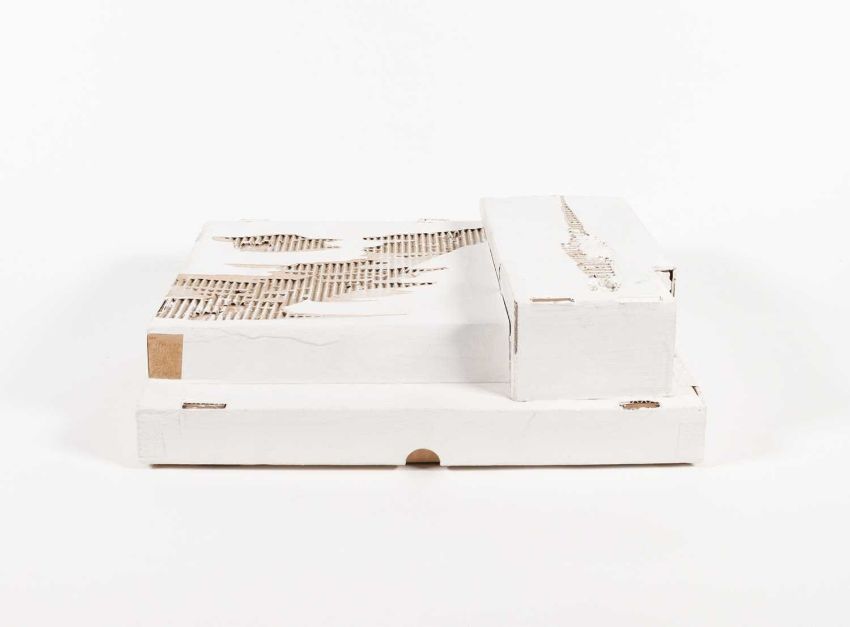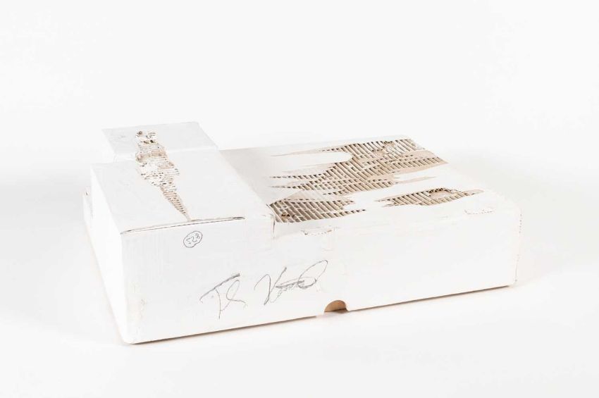 Thomas Virnich: Doppelte Skulptur aus handbemaltem Karton, in der die anderen Objekte ruhen.