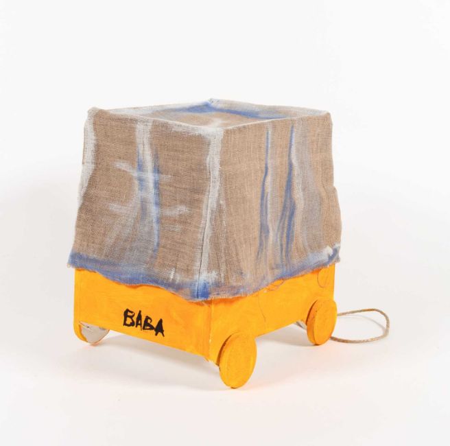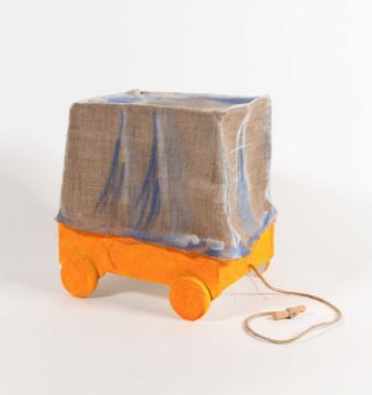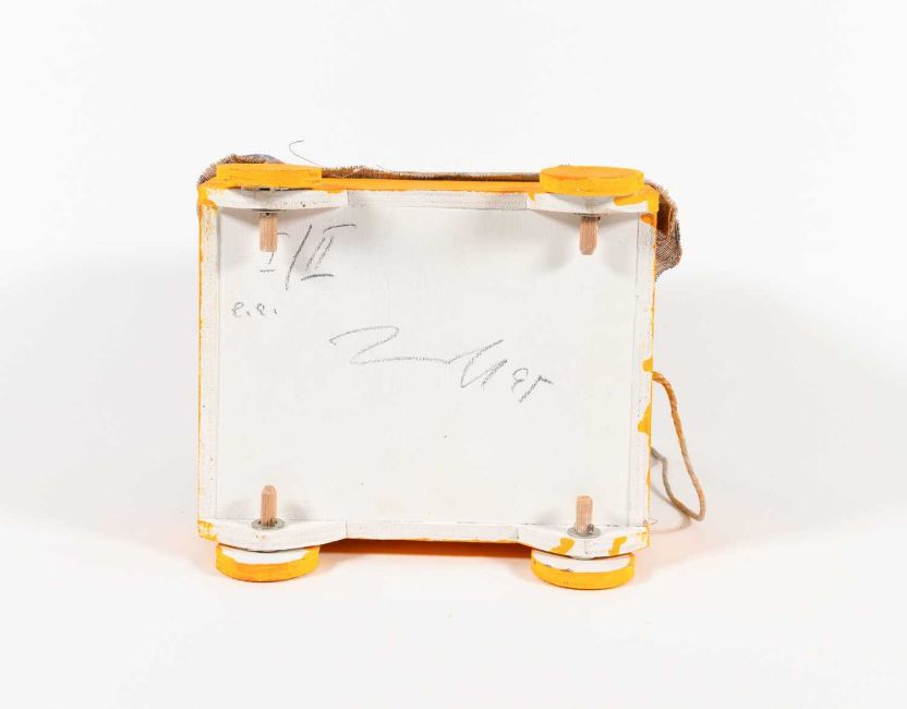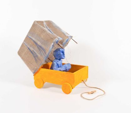 Jörg Immendorff (1945 Bleckede - Düsseldorf 2007) Baba Wagen. 1995. Holzwagen an Kordel mit Dübel, mit handbemalter Leinenabdeckung über Drahtgestänge und innensitzender Styropor-Figur. Auf der Unterseite mit Bleistift signiert, nummeriert und datiert: Immendorff, e.a I/II, 95. Monogrammiert und datiert am linken Hinterrad: J.I., 95. Betitelt auf der Rückseite: Baba. 24,5 x 21,5 x 19 cm.Provenienz:Privatsammlung, Berlin.Angaben zum Künstler:Immendorff studierte an der Düsseldorfer Kunstakademie bei Joseph Beuys.1977 beginnt Jörg Immendorff mit der Serie von 19 großformatigen Gemälden "Café Deutschland", mit denen er die Trennung Deutschlands in BRD und DDR thematisiert.1968, 1972 und 1982 Teilnahme an der documenta.1976 Teilnahme an der Biennale von Venedig.1998 erhält er den Verdienstorden der Bundesrepublik Deutschland sowie 2006 den Goslarer Kaiserring.