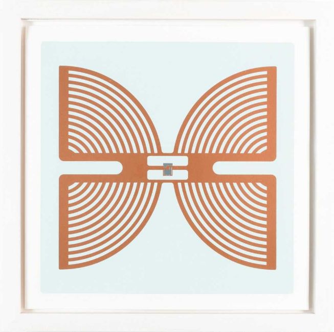 Mark Leckey (1964 Birkenhead – lebt in London) RFID Chip. 2011.Farbserigrafie mit Aluminiumblatt auf Somerset Velin. Verso signiert und nummeriert: M Leckey, x/150.Blattmaß: 31,4 x 31,4 cm.Im Objektrahmen unter Plexiglas gerahmt: 36 x 36,2 cm. Herausgegeben von: Serpentine Gallery, London.Provenienz:Privatsammlung, Berlin. Angaben zum Künstler: Mark Leckey, geboren 1964, wird 2008 mit dem Turner-Preis ausgezeichnet. Seine Arbeiten werden international ausgestellt, darunter Einzelausstellungen im Kölnischen Kunstverein, oder im Le Consortium, Dijon. Seine Performances präsentiert er in New York im MoMA, im Abrons Arts Center, im Institute of Contemporary Arts, London, oder im Guggenheim Museum, New York.Im Werk RFID Chip (2011) beschäftigt sich Leckey mit Computertechnologien und Informationsflüssen. Leckeys Siebdruck spielt mit den vielfältigen Assoziationen, die das labyrinthische Design des Chips hervorruft: Es erinnert an ein Netz, an miteinander verbundene Pfade, an ein industrielles Logo oder sich ständig erweiternde Energielinien.Obgleich das Werk von 2011 ist, greift es den heute aktuellen Diskurs um die Postion von technologischer Innovation innerhalb der Kunst auf und befragt das Verhältnis von Digitalität und Materialität.