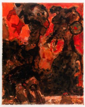 Blalla W. Hallmann (1941 Quirl - Windsbach 1997) Dans les monts de Pommerol. 1989.Öl auf Leinwand.Am unteren Bildrand mit Ölfarbe signiert, betitelt und datiert: Hallmann, Dans les monts de Pommerol, 18.3.89.Bildmaß: 30 x 24 cm.Provenienz:Privatsammlung, Berlin.Galerie Rudolf Zwirner.Hallmann studierte von 1957 bis 1965 Bildende Kunst in Düsseldorf und Nürnberg.Blalla W. Hallmanns Werk beschäftigt sich in drastischer, sowohl blasphemischer als auch obszöner Weise mit existenziellen Grundfragen (Religion und Sexualität). Formal bewegt es sich zwischen Surrealismus, Außenseiterkunst (Art Brut), Volkskunst und zahlreichen Anlehnungen an die Kunstgeschichte.1965 war er Gründungsmitglied eines Wandertheaters, des späteren „Hoffmanns Comic Teater“. Aus Mitgliedern dieser Gruppe ging später die Rockband Ton Steine Scherben hervor.Von 1967 bis 1969 hielt Hallmann sich in den USA auf und lernet dort den Comiczeichner Robert Crump kennen.1968 lehrte er an der University of California in San Francisco.Nach einem Aufenthalt in einer psychiatrischen Anstalt im Jahr 1969 zerstörte er 1970 alle ihm verfügbaren eigenen Arbeiten. Von 1992 bis 1995 hatte Hallmann eine Professur an der Hochschule für Bildende Künste Braunschweig.