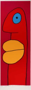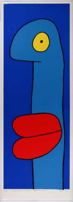 Thierry Noir (1958 Lyon – lebt in Berlin) Jaques fait des Crêpes Grand Marnier / François fait des heures supplémentaires. 1990.Zwei Farbserigrafien, jeweils auf Platte. Vom Künstler rückseitig aneinander montiert.Jeweils unterhalb der Darstellung signiert, betitelt, datiert und nummeriert: Noir, Jaques fait des Crêpes Grand Marnier bzw. François fait des heures supplémentaires, 1990, 6/20 bzw. 8/20.Jeweils Bildmaß: 134 x 47 cm.Gerahmt: 135 x 48 cm.Provenienz:Privatsammlung, Berlin.• Thierry Noir, 1958 in Lyon geboren, lebt und arbeitet seit 1982 in Berlin.• 1984 begann er mit Christophe-Emmanuel Bouchet und Kiddy Citny die Berliner Mauer zu bemalen.• Mit seinen rundlichen glubschäugigen Köpfen, meist gemalt in ungebrochenen klaren Farben, prägte er das Bild der Mauer auf der Westseite. Noir malt seine Bilder farbenfroh, dies strahlt Lebensfreude aus. Typisch sind für Noir bunte Köpfe im Profil mit hervorstehender Nase, riesengroßen Lippen, Kulleraugen und rundem Schädel. „Es ist die Poesie des Augenblicks, die Poetik der Sekunde, die Ironie des Momentanen, um die es mir geht“, so Noir 1996.