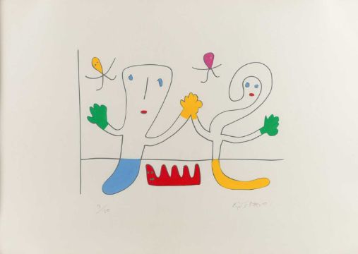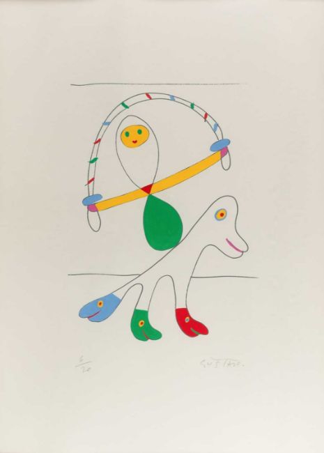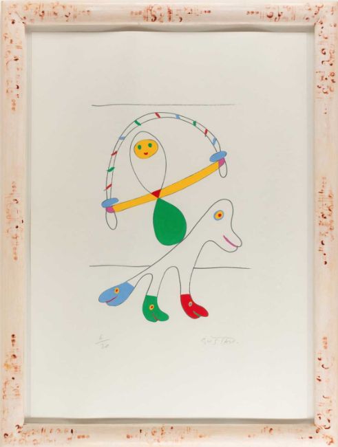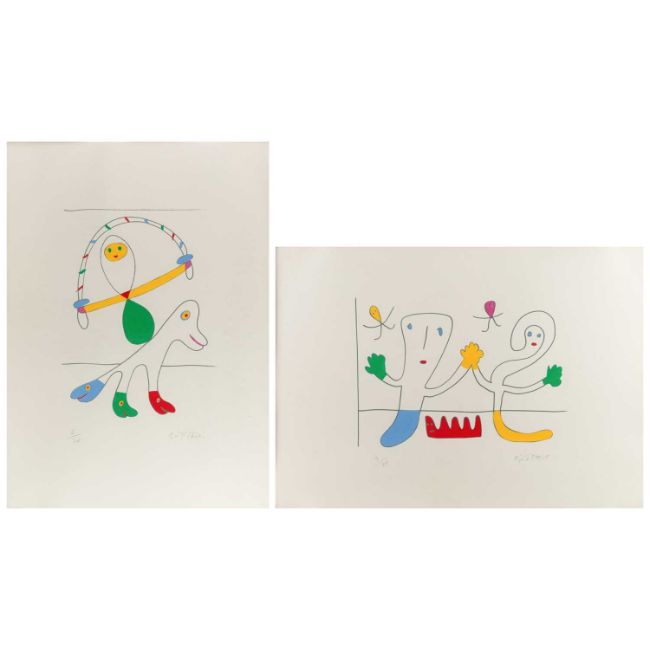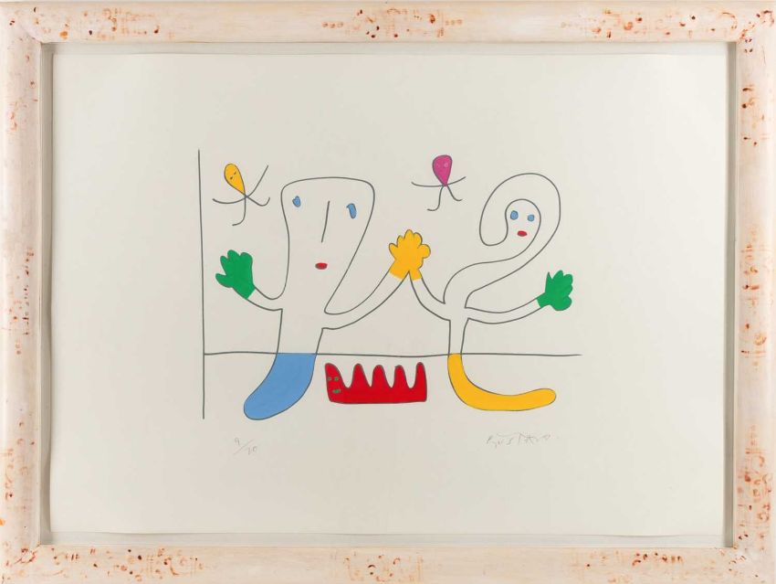 Gustavo (1939 Cartagena – lebt in Mallorca) Ohne Titel.Zwei handkolorierte Farbserigrafien, jeweils auf leichtem Karton. Jeweils unterhalb der Darstellung mit Bleistift signiert und nummeriert: GUSTAVO, 6/20 bzw. 9/20. Blattmaße: 70 x 50 bzw. 50 x 70 cm.Jeweils unter Glas gerahmt: 80,6 x 60,3 cm bzw. 60,3 x 80,6 cm.Provenienz:Privatsammlung, Berlin.