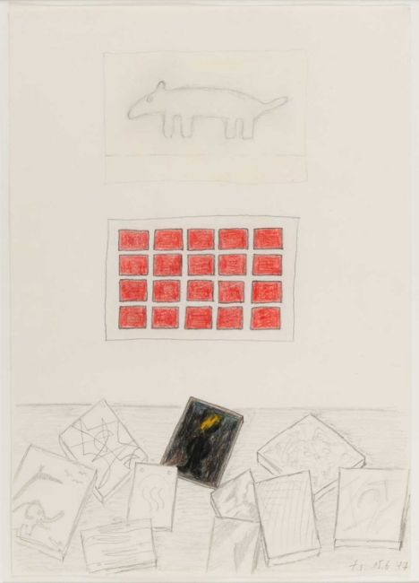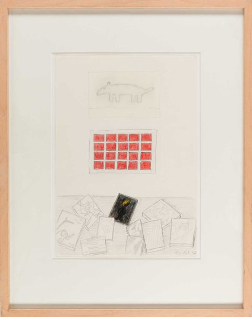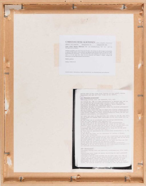 Tomas Schmit (1943 Wipperfürth - Berlin 2006) Bülacher Bildertraum. 1977.Bleistift und Buntstift auf Papier. Am unteren Blattrand mit Bleistift: t.s.15.6.77.Blattmaß: 30,5 x 21,5 cm. Im Passepartout freigestellt und unter Glas gerahmt: 48 x 38,5 cm.Provenienz:Privatsammlung, Nordrhein-Westfalen.Angaben zum Künstler:• Tomas Schmit (1943–2006) war ein deutscher Künstler und Dichter, der für seine experimentelle und konzeptuelle Kunst bekannt war.• Er war Teil der Fluxus-Bewegung, die sich durch interdisziplinäre und avantgardistische Ansätze in Kunst und Musik auszeichnete.• Schmits Arbeit erstreckte sich über verschiedene Medien wie Texte, Zeichnungen, Collagen, Objekte und Performances.• Er setzte sich humorvoll und kritisch mit Sprache, Kommunikation und den Konventionen der Kunstwelt auseinander.• Seine Werke zeugen von einer spielerischen Herangehensweise und einem Sinn für das Absurde und Ironische.• Schmit nahm an zahlreichen Fluxus-Veranstaltungen und Happenings teil und arbeitete eng mit anderen Künstlern der Bewegung zusammen.• Sein Werk hinterfragt tradierte Vorstellungen von Kunst und fordert den Betrachter dazu auf, über die Bedeutung von Kunst und Kreativität nachzudenken.