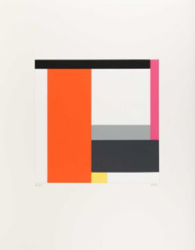 Walter Dexel (1890 München - Braunschweig 1973) Komposition mit rotem Balken. 1971.Farbserigrafie auf Velin. Unterhalb der Darstellung mit Bleistift signiert und nummeriert: W. Dexel, 2/100. Blattmaß: 68 x 53,5 cm.Provenienz:Privatsammlung, Niedersachsen.
