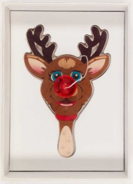 Jeff Koons (1955 York – lebt in New York) Paddle Ball Game. Rudolf the rednosed Reindeer. 2000. Thermoprint auf Birkenholz in Original Box. Verso typografisch bezeichnet: copyright jeff koons 2000 for the deutsche guggenheim berlin. Maße: 32 x 20 x 5 cm. Herausgegeben von: Deutsche Guggenheim Edition, Berlin.Provenienz:Privatsammlung, Berlin.Angaben zum Künstler: Jeff Koons reizt unsere Vorstellungen von Geschmack, Vergnügen, Berühmtheit und Kommerz in seinem Werk aus.„Ich glaube voll und ganz an Werbung und Medien“, sagt er. „Meine Kunst und mein Privatleben basieren darauf.“Koons arbeitet mit verführerischen kommerziellen Materialien (wie dem hochverchromten Edelstahl seiner Ballonskulpturen oder seinen „Inflatables“ aus Vinyl), Maßstabsverschiebungen und einem ausgeklügelten Studiosystem, an dem viele Techniker beteiligt sind. Er verwandelt banale Objekte in hochkarätige Kunstikonen und nimmt weitgehend Anleihen bei kunsthistorischen Techniken und Stilen. Obwohl Koons oft kritisch gesehen wird, besteht er darauf, dass seine Praxis ernsthaft und optimistisch ist. „Ich habe Surrealismus und Pop schon immer geliebt, also verfolge ich einfach meine Interessen und konzentriere mich darauf.“Die „Banality“-Serie, die ihn in den 1980er Jahren berühmt machte, umfasste Skulpturen von Motiven wie Michael Jackson mit seinem Haustieraffen und seine monumentalen Formschnitte wie die Blumen Puppy (1992) ist eine Referenz an die französische Gartengestaltung des 17. Jahrhunderts.
