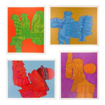 Heinz Trökes (1913 Hamborn am Rhein - Berlin 1997) Rebus. 1970.Vier Farbserigrafien, jeweils auf leichtem Karton. Aus dem Mappenwerk Rebus. Jeweils mit Bleistift signiert und nummeriert: Trökes, EA. Blattmaß jeweils: 65 x 80 cm.Provenienz:Privatsammlung, Niedersachsen.