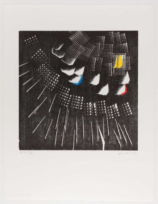 Hans Hartung (1904 Leipzig - Antibes 1989) H-7-1974. 1974.Farbholzschnitt auf Velin. Unterhalb der Darstellung mit Bleistift signiert und nummeriert, am unteren Blattrand mit Bleistift betitelt: Hartung, H-7-1974, E.A II/XV.Blattmaß: 65 x 55,5 cm. Herausgegeben von: Erker Presse St. Gallen, mit Trockenstempel.Provenienz:Privatsammlung, Berlin.Angaben zum Künstler:• Hans Hartung studierte Malerei an der Hochschule für Grafik und Buchkunst Leipzig und der Hochschule für Bildende Künste Berlin, sowie bei Max Doerner an der Akademie der Bildenden Künste München.• Er gilt als Wegbereiter der informellen Malerei und entwickelte seinen eigenen expressiven Stil, der durch breite, schwungvolle Pinselstriche und abstrakte Formen gekennzeichnet war.• Sein dynamischer Mal- und Zeichenstil ist beeinflusst von der Angst vor Blitzen in seiner Kindheit, die er damit verarbeitete.• Während des Zweiten Weltkriegs kämpfte Hartung für die französische Armee und wurde schwer verwundet, was seine künstlerische Arbeit beeinflusste.• Hartung war Teilnehmer der ersten documenta , der documenta II, der documenta III und wurde 1960 mit dem Preis der Biennale von Venedig ausgezeichnet.