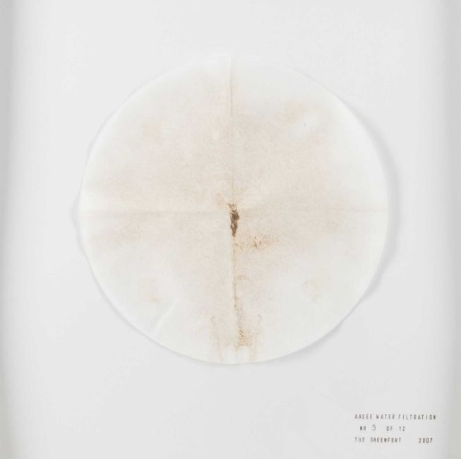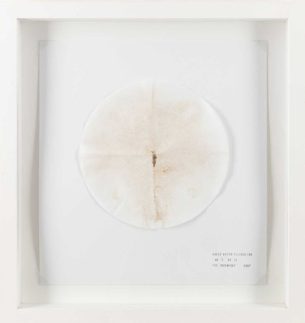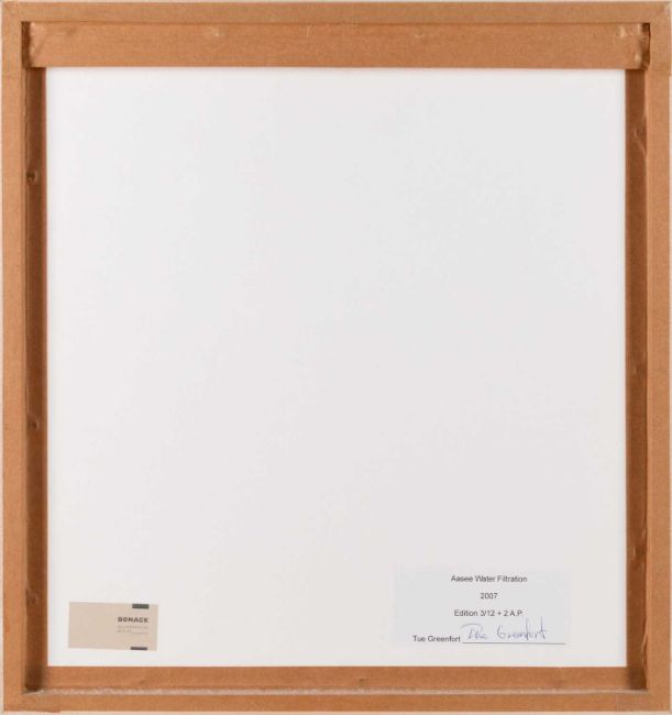 Tue Greenfort (1973 Holbæk – lebt in Horbelev) Aasee Water Filtration. 2007.Wasserfilter montiert auf Papier.Unterhalb der Darstellung typografisch bezeichnet, betitelt, datiert und nummeriert: Tue Greenfort, Aasee Water Filtration, 2007, NR 3 OF 12.Verso auf einem Editionsetikett signiert, betitelt, datiert und nummeriert: Tue Greenfort, Aasee Water Filtration, 2007, 3/12 + 2 A.P. Blattmaß: 29 x 28 cm. In einem Objektrahmen unter Glas gerahmt: 38,5 x 36,3 cm. Literatur: Tue Greenfort, „Diffuse Einträge“, in: Brigitte Franzen, Kasper König und Carina Plath (Hrsg.), skulptur projekte münster 07, Münster/Köln 2007, S.117.Provenienz:Privatsammlung, Berlin.Angaben zum Künstler:Dänischer Künstler, der für seine Freiland-Installationen bekannt ist.Greenfort studierte von 1997 bis 2000 an der Funen Art Academy in Odense bei Jesper Christiansen (Künstler) und Lars Bent Petersen.2000 bis 2003 Städelschule, wo er bei Thomas Bayrle studierte.Greenforts Arbeiten bewegen sich in dem Dreieck Mensch-Natur-Umwelt.Auf der dOCUMENTA (13) wirkte er an dem Archiv The Worldly House mit.Seit September 2011 ist er Professor an der Funen Art Academy.