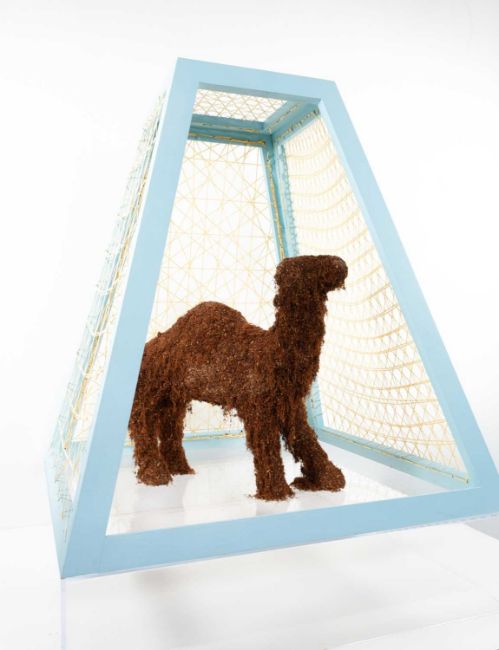 Lisa Lapinski (1967 Palo Alto – lebt in Los Angeles) Tobacco Camel. 2011.Tabak Kamel (Camel), auf Plexiglasplinthe unter Holz und Schilfrohr. Auf einem beiliegenden Zertifikat signiert: Lisa Lapinski. Dort mit den technischen Angaben.Maße: 93 x 73 x 73 cm.Provenienz:Privatsammlung, Berlin.Mit ihren Tobacco Camels greift Lapinski das Camel-Kamel, eine Ikone des Frühkapitalismus, auf. Die Kombination von Pyramiden, Palmen und einem einhöckrigen Dromedar, die das Camel Logo zeigt, ist heute auch als tiefer Ausdruck eines Orientalismus zu verstehen, der nicht zuletzt eine Aura des Exotischen und Wilden vermitteln sollte, um Rauchen zu mystifizieren. Lapinski demaskiert diese Verhältnisse und greift, mit ihrer Tabakgeruch ausströmenden Skulptur, wie so oft in ihren Arbeiten, Bilder des Alltags auf. Und sie präsentiert sie uns in einer Weise, die ein anderes Nachdenken darüber ermöglichen.