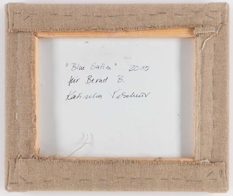 Katinka Pilscheur (1974 Herdecke an der Ruhr – lebt in Berlin) Blue Satin. 2010. Nagellack auf Leinwand.Verso signiert, betitelt, datiert und gewidmet: Blue Satin, Katinka Pilscheur, 2010. Bildmaß: 25 x 30 cm.Provenienz:Privatsammlung, Berlin.Angaben zur Künsterlin:Die Werke von Katinka Pilscheur bewegen sich im Spektrum von Malerei, Skulptur und Architektur.Aus banalen Materialien und Anregungen aus dem Alltagsleben wird Kunst, die unsere Vorstellung vom Raum sowie den Begriff der Kunst selbst in Frage stellt. Pilscheurs unbestimmte Objekte und ungewöhnliche Materialien mögen vertraut scheinen, werden aber so angeordnet und verändert, dass sie sich in etwas gänzlich Ungekanntes verwandeln.