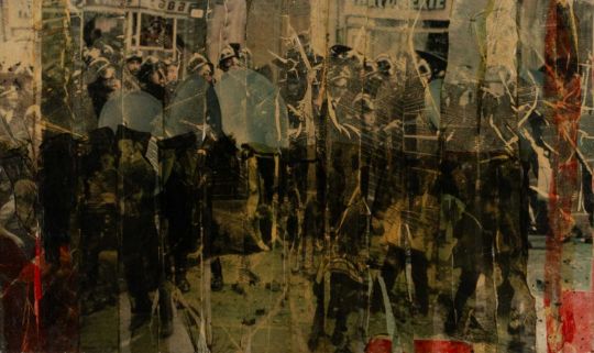 Gil J. Wolman (1929 Paris 1995) Ohne Titel (Mai 68). Um 1968.Druckfarbe, Kleister und Papierstreifen auf Leinwand collagiert.Bildmaß: 33 x 45 cm.Im Objektrahmen unter Glas gerahmt: 42 x 64 cm.Verso mit einem Etiektt Lara Vincy, Paris.Ausstellung: "Facing the Future. Art in Europe 1945-1968", BOZAR Brüssel, 2016 / ZKM Karlsruhe, 2017 / Pushkin Museum Moskau, 2017, Kat. S. 479.Provenienz:Privatsammlung, Nordrhein-Westfalen.Angaben zum Künstler:Die Arbeiten des in Frankreich geborenen Künstlers Gil J. Wolman umfasste Malerei, Film und Poesie. Seine Kunst ist dem „Lettrismus“ zuzuordnen, einer frühen 1950er Jahre Avantgarde-Bewegung von Isidore Isou. In seinen Werken fokussierte er sich auf die europäische Geschichte.