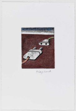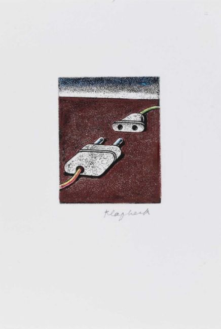 Konrad Klapheck (1935 Düsseldorf 2023) Begegnung. 2000.Handkolorierte Radierung auf Bütten. Unterhalb der Darstellung mit Bleistift signiert: Klapheck.Außerhalb einer Auflage von 100 nummerierten Exemplaren.Blattmaß: 28 x 19 cm.WVZ.: Wessolowski 53 (nicht koloriert).Provenienz:Privatsammlung, Rheinland.Angaben zum Künstler:Konrad Klapheck war ein deutscher Grafiker, Maler, Künstler und Dozent an der Kunstakademie Düsseldorf.Er gilt heute als Klassiker der Nachkriegs-Avantgarde.In seinem Malstil verschränkt er Elemente des Neorealismus und des Surrealismus zu einem eigenen Stil, an dem er bis zu seinem Tod 2023 festhielt.In Paris lernte er André Breton kennen, der ihm ein Bild abkauft und es neben Werke von Miró und Max Ernst platziert.Seit den 1950er-Jahren malte Klapheck technische Geräte: Maschinen, Apparate und elektronische Alltagsgegenstände. Geprägt vom Wirtschaftswunder-Maler reichen seine Sujets von Schreibmaschinen, Nähmaschinen, Wasserhähnen und Duschen über Telefone, Bügeleisen, Schuhspanner und Schuhen, bis zu Schlüsseln, Sägen, Autoreifen, Fahrradschellen und Uhren. Das Klapheck gilt als wichtigster „Maschinenmaler“.