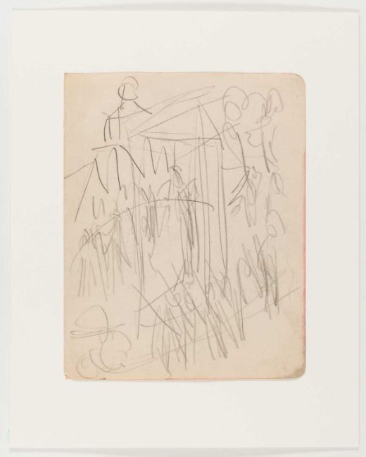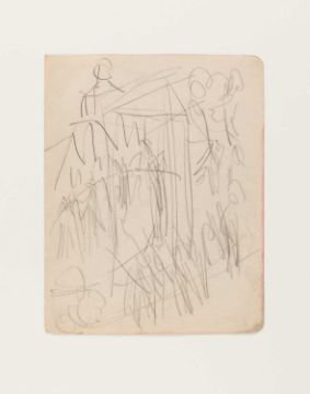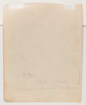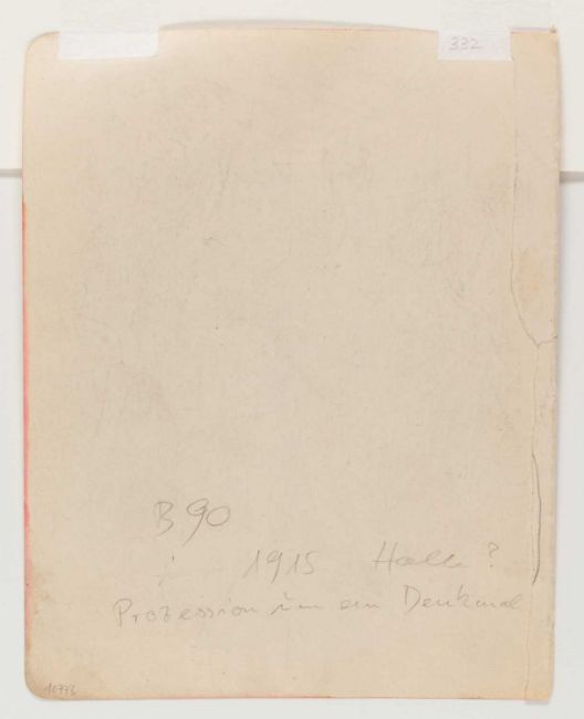 Ernst Ludwig Kirchner (1880 Aschaffenburg - Davos 1938) Prozession in ein Denkmal. 1910-11.Bleistift auf Velin, auf Unterlagenkarton montiert.Verso von fremder Hand mit Bleistift bezeichnet: Prozession in ein Denkmal. 1915.Blattmaß: 21 x 16,5 cm.Vermutlich aus Skizzenbuch Nr. 25: Tellerjongleur. - Chansonette. - Bartanz. - Clown und Tänzerin. - Badende. - Wannsee.Werkverzeichnis: Presler, vermutl. Skb 25.Provenienz:Privatsammlung, Berlin.Erworben bei Galerie Kornfeld, Auktion 271, 2019.